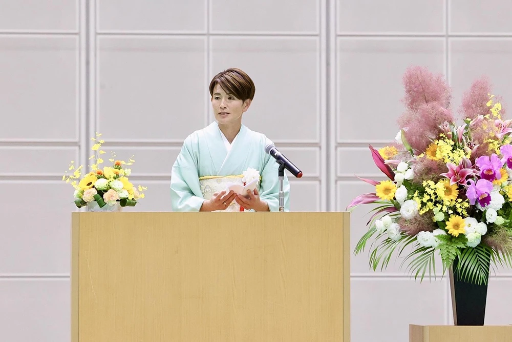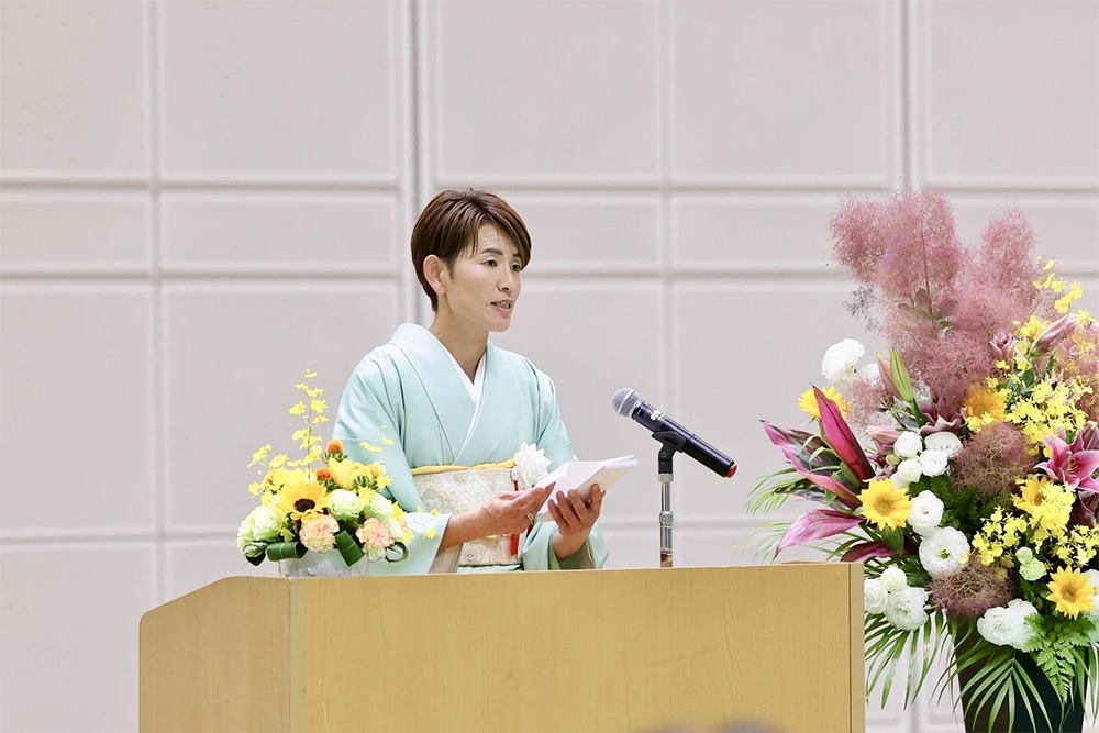 創立100周年記念式典にて同窓会会長として祝辞を贈った、元サッカー女子日本代表の池田さん。