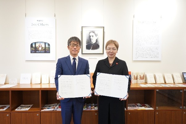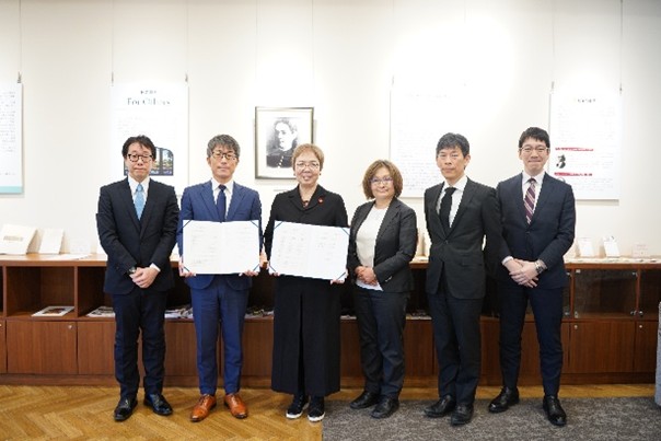 2026年2月4日に本校はフェリス女学院大学と高大連携に関する協定を締結しました。協定締結に伴い、フェリス女学院大学ウエルカムセンターにて締結式を開催しました。フェリス女学院大学からは小檜山ルイ学長、上原良子事業推進担当副学長、大谷智夫大学事務部長、口井智史学長室長が、また本校からは山浦秀一理事長兼校長、堀口崇進路指導係長が列席し、協定書を取り交わしました。