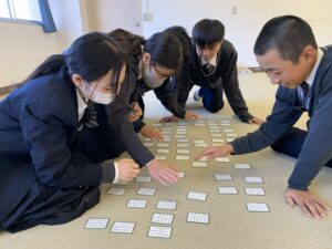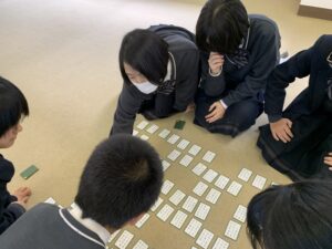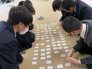 上の句五文字を耳にした瞬間、札に手が行く生徒、下の句を耳にしても微動だにしない生徒、それぞれの得意が異なるところが本一流。
